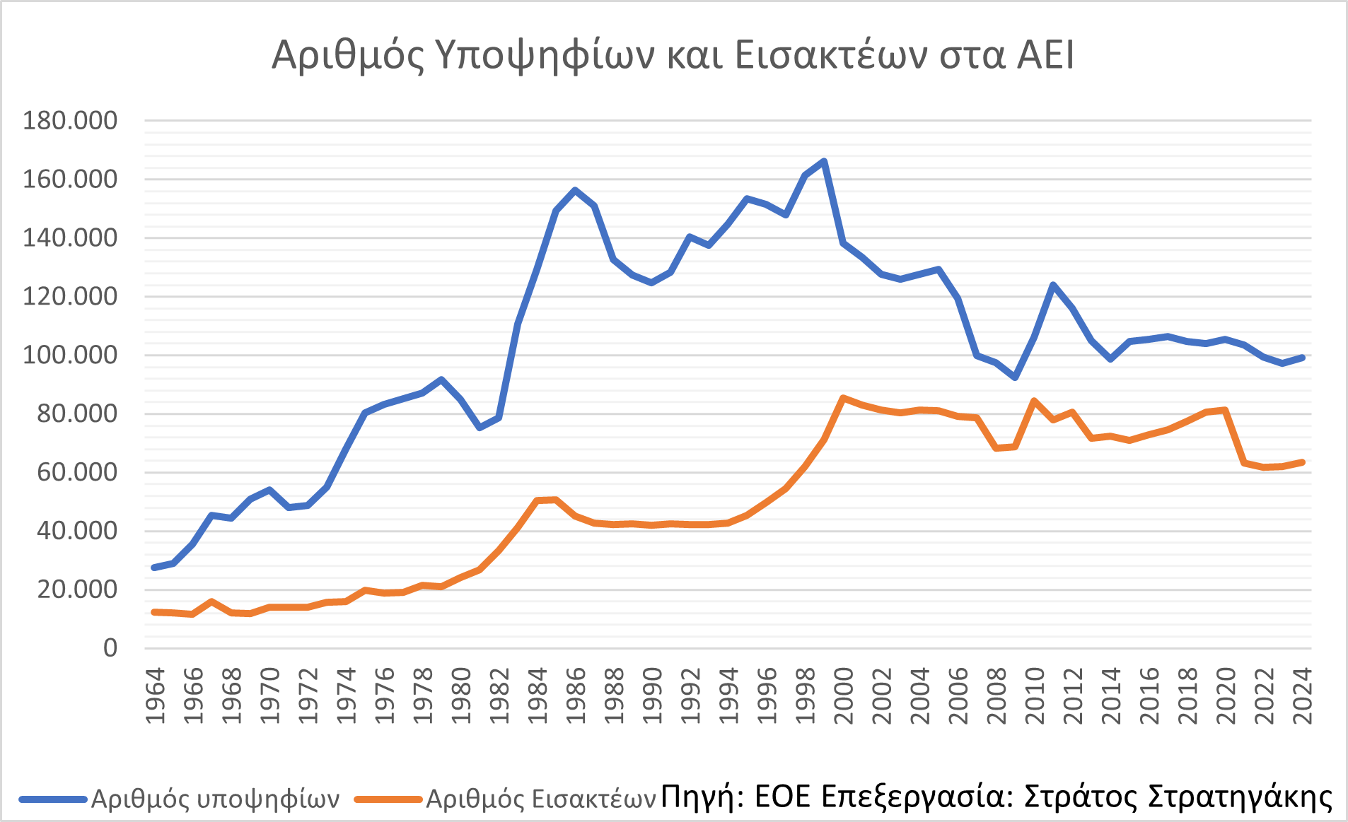 Τα χρόνια της κρίσης ο αριθμός των εισακτέων κρατήθηκε ψηλά. Καμία χρονιά δεν έπεσε κάτω από 71.000 για να φτάσει το 2020 στους 81.413, με ποσοστό επιτυχίας το 78%, που αποτελεί το μεγαλύτερο ποσοστό επιτυχίας στα ΑΕΙ· στην πράξη πέρασαν όλοι. Έτσι μειωνόταν και η απίστευτη ανεργία εκείνης της περιόδου.